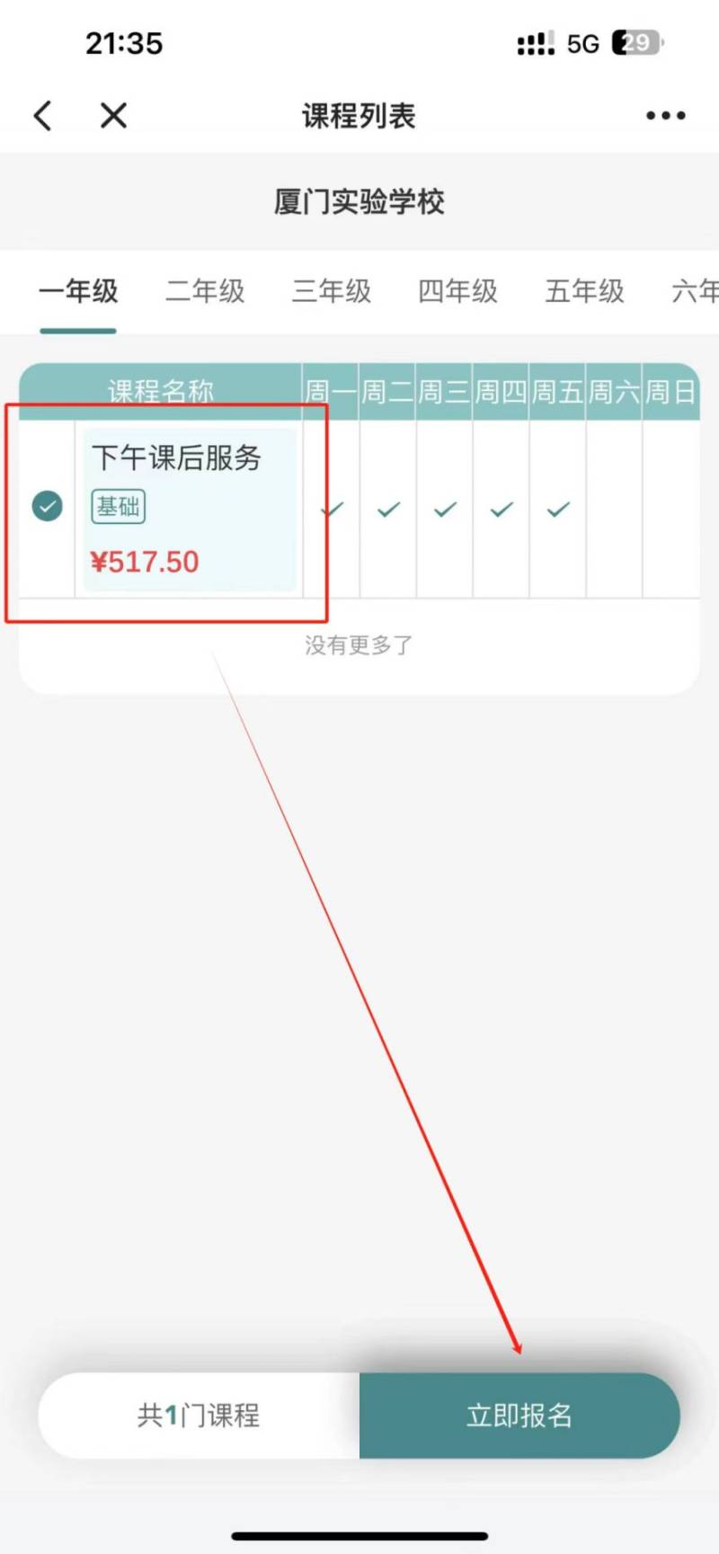 家长选择学校后,搜索课程并选择购买。目前系统支持“下午课后服务”,勾选课程后,点击【立即报名】即可。