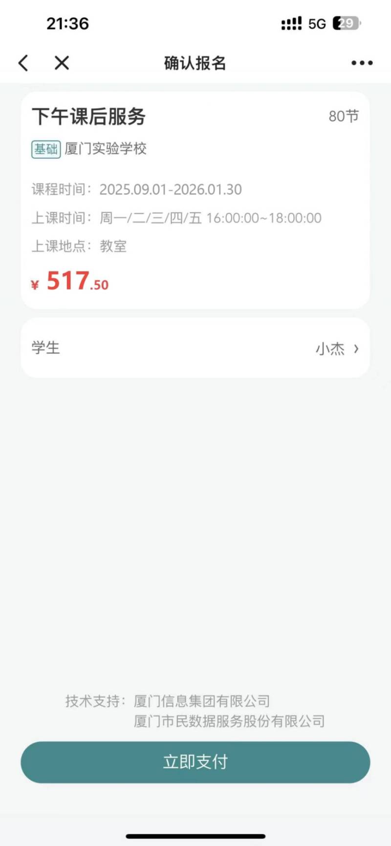 家长确认报名的课程无误,可点击下方按钮【立即支付】,完成课后服务课程的支付。