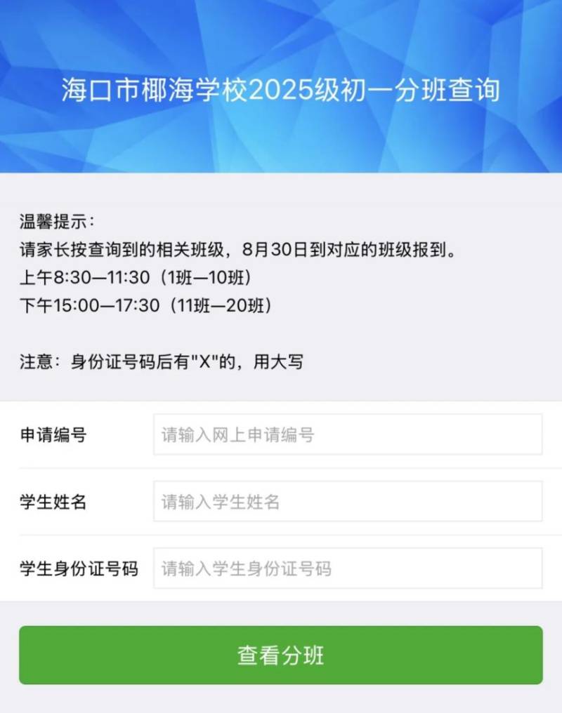 感谢您选择海口市椰海学校,请您用微信扫一扫(或长按识别)下方二维码,进入分班查询小程序,输入学生的网上申请编号、学生姓名、学生身份证号码,点击“查看分班"按钮,可查询您孩子的班级。