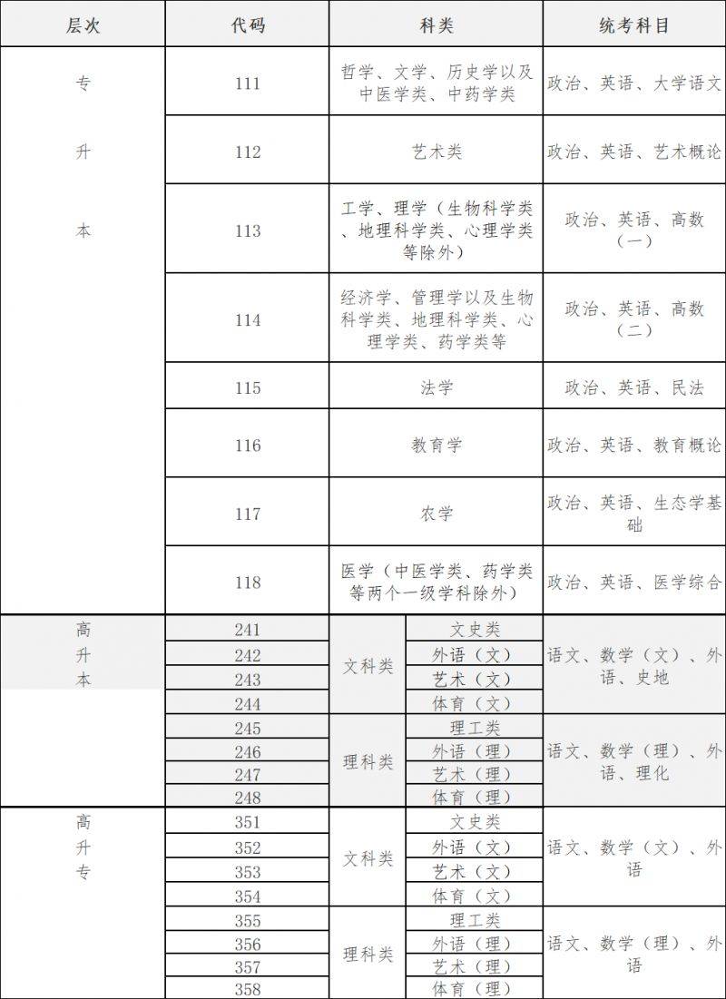 (一)专升本、高起本、高起专三种层次对应的报考代码、科类及统考科目如下: