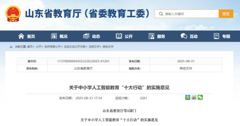 近日山东省教育厅等六部门印发《中小学人工智能教育“十大行动”的实施意见》要求今年秋季开学中小学开展人工智能通识教育课。