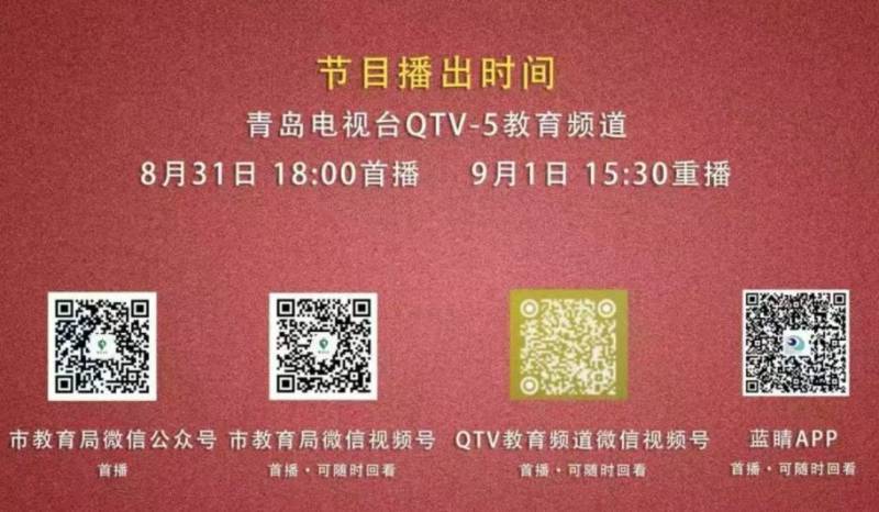 该节目将于8月31日18:00在青岛市广播电视台教育频道(QTV-5)、市教育局微信公众号、市教育局微信视频号、QTV教育频道微信视频号及“蓝睛”APP同步播出,9月1日15:30在QTV-5重播。