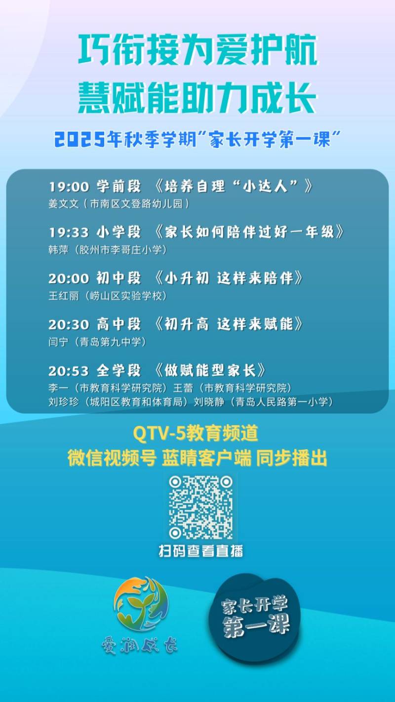 8月28日,由青岛市教育局组织邀请了8位名师专家在“家长开学第一课”与各位家长朋友们一起探讨近日来家长们关注的热点问题。围绕“巧衔接为爱护航,慧赋能助力成长”主题,为全学段孩子提供科学的育儿方法,助力孩子全面健康成长,顺利适应新学期。