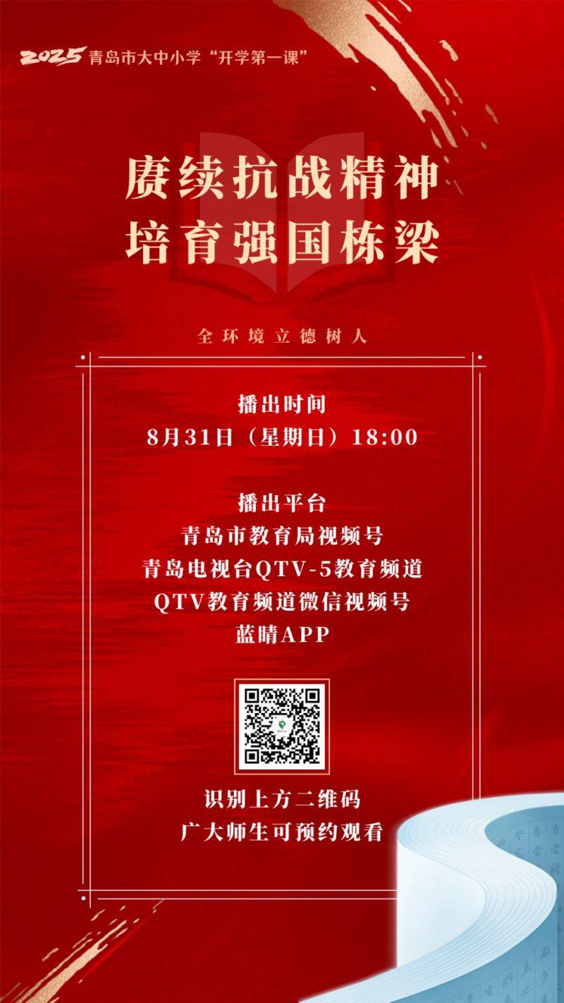 该节目将于8月31日18:00在青岛市广播电视台教育频道(QTV-5)、市教育局微信公众号、市教育局微信视频号、QTV教育频道微信视频号及“蓝睛”APP同步播出,9月1日15:30在QTV-5重播。