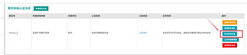 2025年上半年及以后,应届毕业生需要补充有效学历后,方可在中国教师资格网查询对应申请认定的教师资格证书,如不补充学历,将不提供对应教师资格证书的查询服务。目前系统允许申请人于认定通过后“补充学历信息”功能已经上线。请及时登录账号,查询报名信息,点击操作栏对应的补充学历按钮,及时补充有效学历信息,以免影响教师资格证书的领取和查询。补充学历时,系统也会和学信网进行学历核验,对没有核验到或无法核验到的学历(专科以下学历、港澳台、国外学历),需要由认定机构审核。