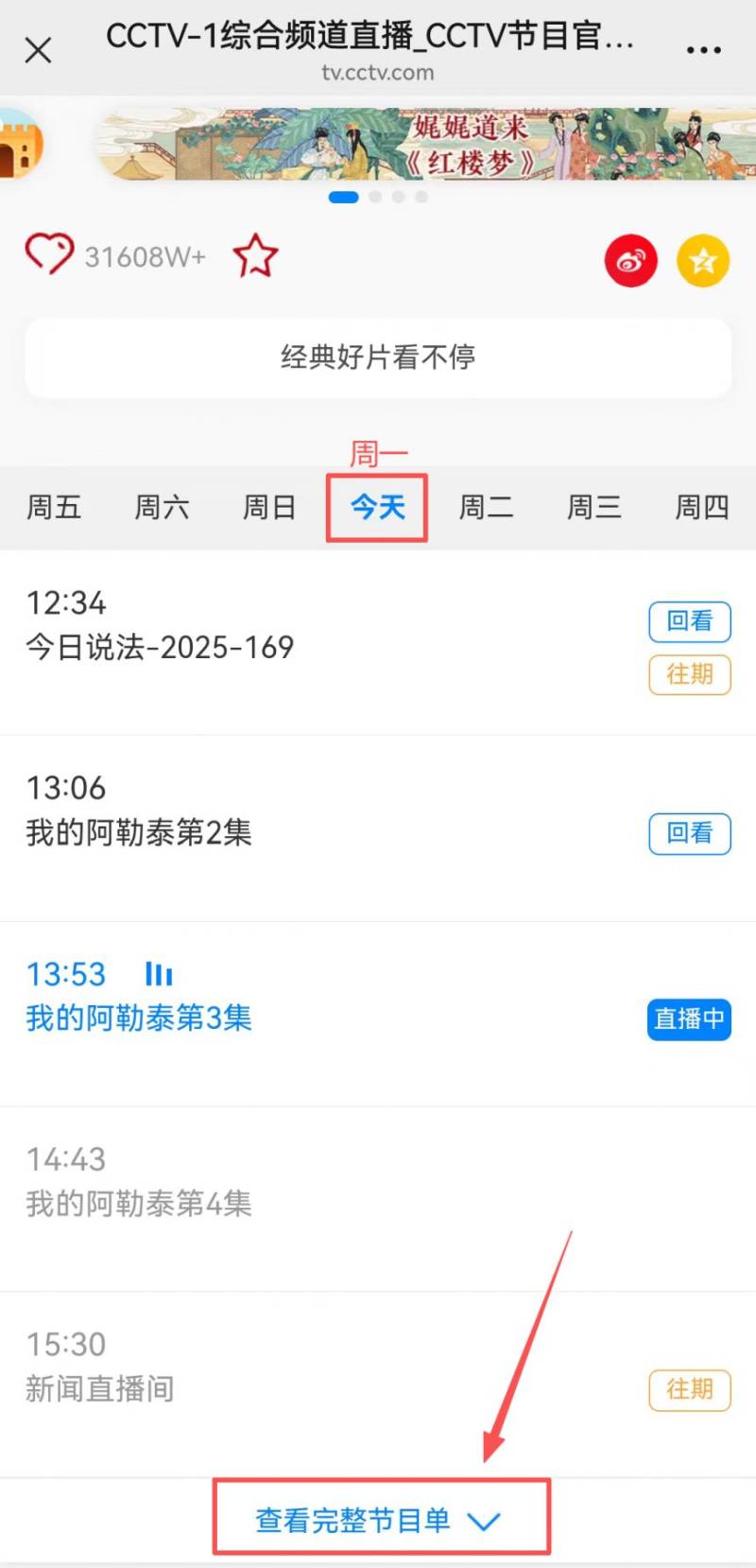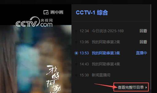 1、进入cctv1网页,点击右侧“查看完整节目单”