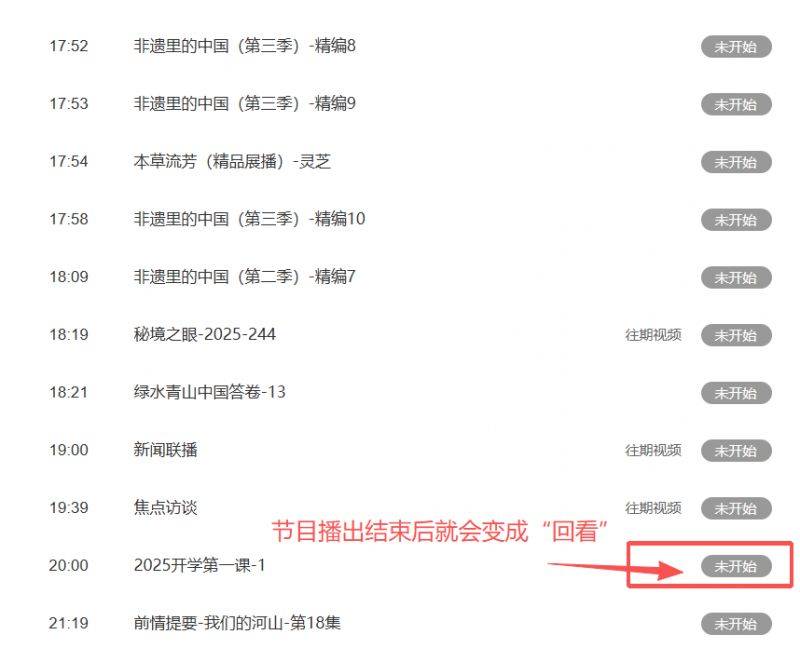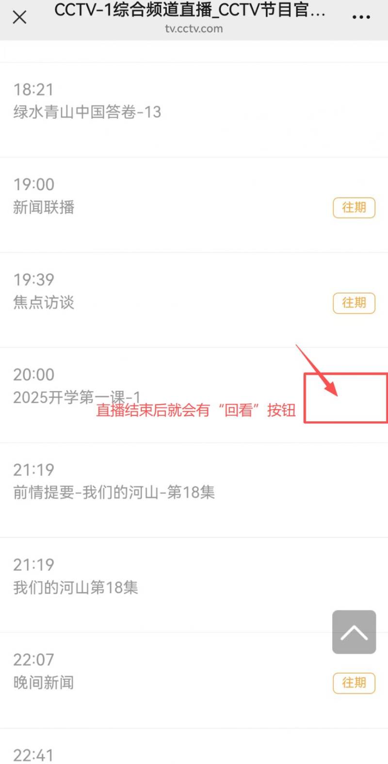 2、找到央视开学第一课的播出时间(2025年9月1日20:00),点击“回看”,即可观看节目。