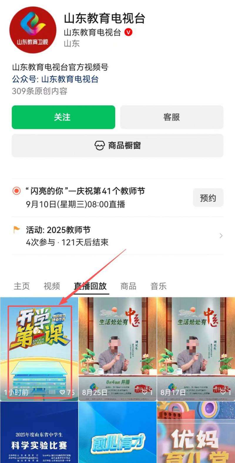 1、在“山东教育电视台”微信视频号主页点击“直播回放”可看录制视频