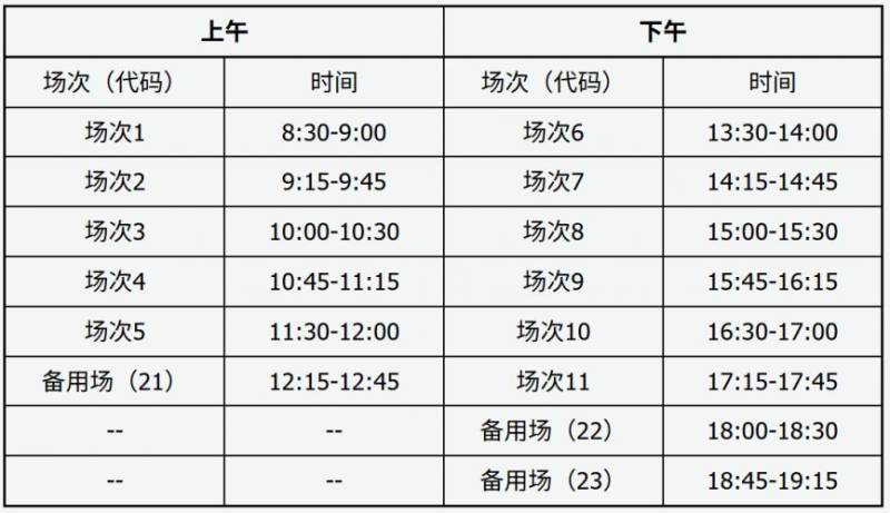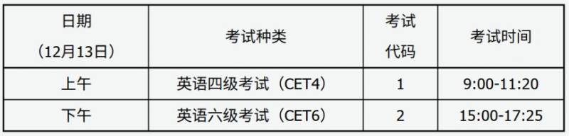 (CET-SET4)英语四级口语考试时间为11月22日,(CET-SET6)英语六级口语考试时间为11月23日,具体场次安排如下: