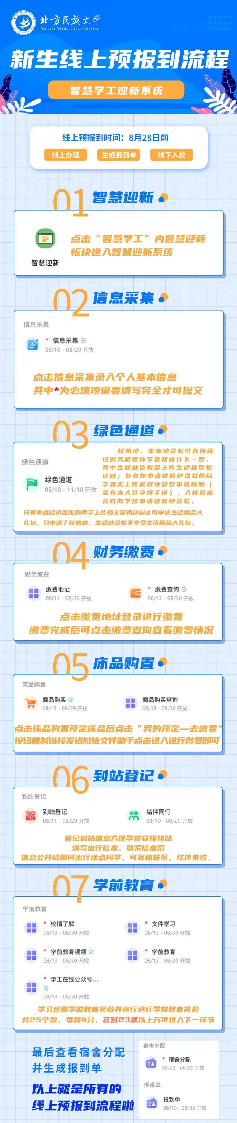 新生在8月28日前登录“智慧学工”迎新系统,按照相关操作流程完成线上基本信息采集、学费缴纳、宿舍分配等程序进行预报到,新生完成预报到后系统自动生成报到单。(新生报到工作均在线上进行,智慧学工系统为唯一报到方式。具体查看下方新生线上预报到流程)