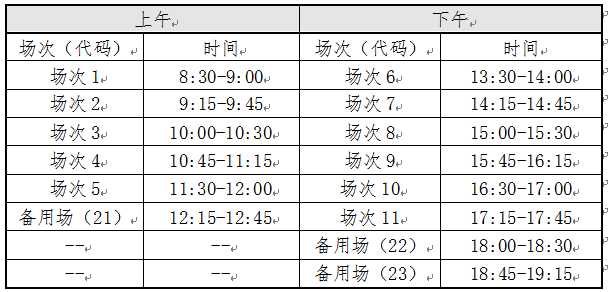 英语四级口语考试(CET-SET4)考试时间为11月22日(F253次),英语六级口语考试(CET-SET6)考试时间为11月23日(S254次),具体场次安排如下: