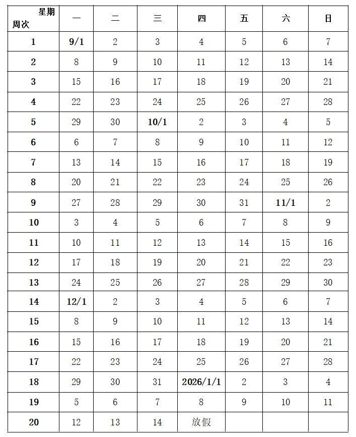 ·按照《义务教育课程方案和课程标准(2022年版)》要求,2025-2026学年度共39周。一至八年级新授课时间35周,复习考试时间2周,学校机动时间2周;九年级新授课时间33周,第一学期复习考试时间1周,第二学期毕业复习考试时间3周,学校机动时间2周。学校机动时间可用于集中安排劳动、科技文体活动等。