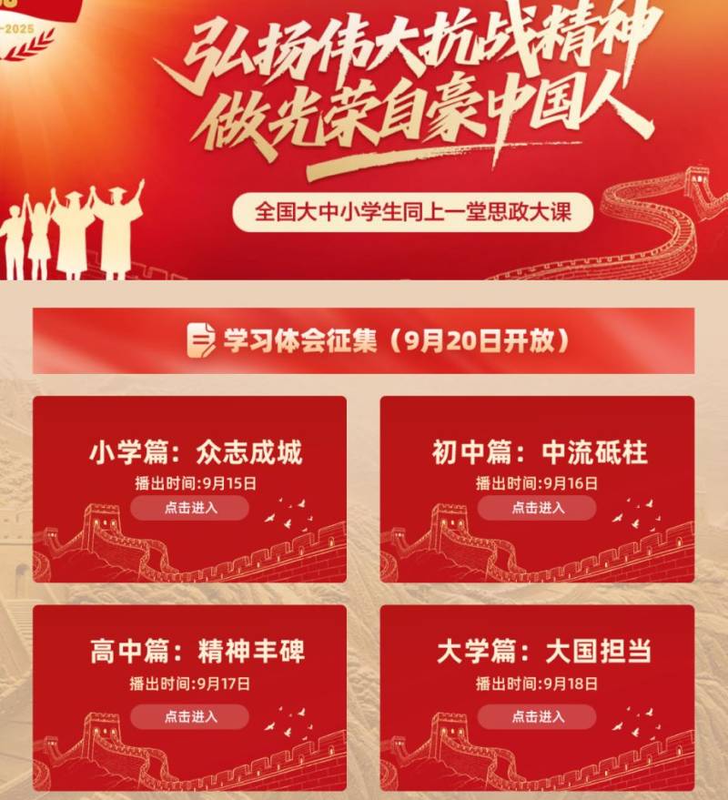 本次思政大课分为小学课程“众志成城”、初中课程“中流砥柱”、高中(中职)课程“精神丰碑”、大学课程“大国担当”四个篇章,按学段在9月15日至18日依次推出。