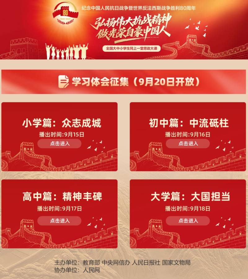 为纪念中国人民抗日战争暨世界反法西斯战争胜利80周年,全国大中小学生同上一堂思政大课,弘扬伟大抗战精神,做光荣自豪中国人,明天让我们重回烽火岁月,聆听英雄故事,感悟众志成城。