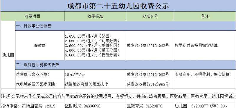 根据省教育厅《关于进一步加强教育收费管理有关事项的通知》要求,现将成都市第二十五幼教育集团收费信息公示如下:
