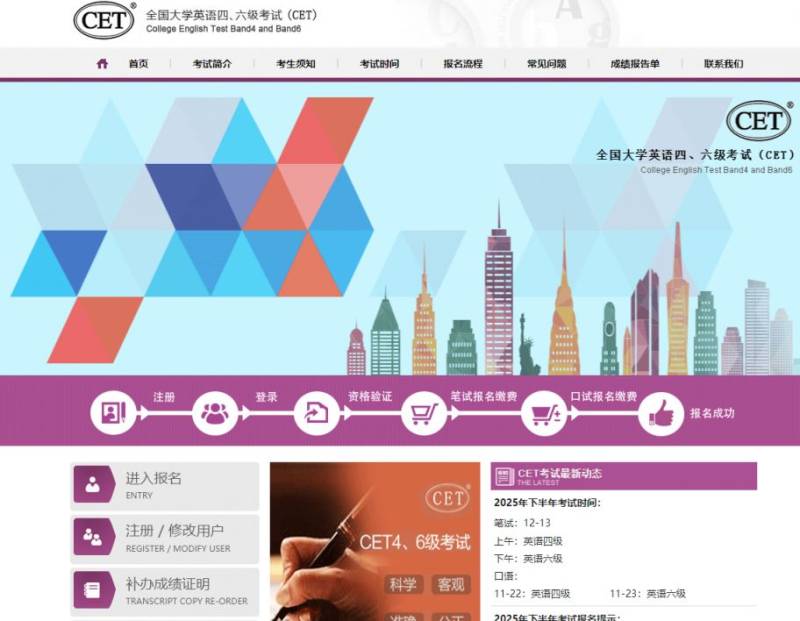 CET考试时间为12月13日,开考科目为英语四级和六级;