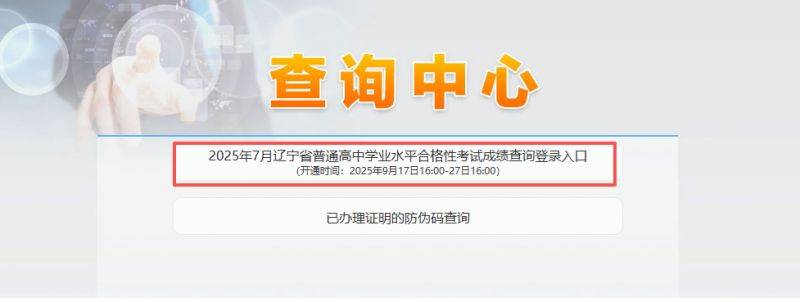 ·登录“辽宁招生考试之窗”网站(点击进入 ),进入“查询中心”,选择“2025年7月辽宁省普通高中学业水平合格性考试成绩查询登录入口”后跳转到查询主页