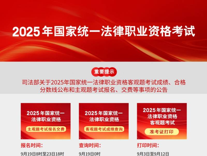 2025年国家统一法律职业资格主观题考试报名和交费时间为9月19日8时至9月23日18时。2024年客观题考试保留有效成绩人员、2025年客观题考试成绩合格人员,应于规定期限内登录司法部官网确认参加主观题考试并交纳考试费。