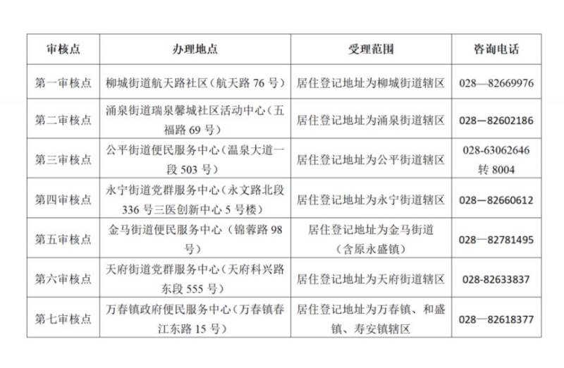 温江区将设立7个线下审核点,不会网上操作或需要补充材料的申请人,可于4月10日—4月30日期间的星期三、五下午,到各镇街审核办理点咨询或办理。