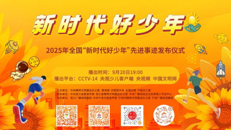 9月20日19:00,由中央精神文明建设办公室、教育部、共青团中央、全国妇联、中国关工委联合举办的2025年全国“新时代好少年”先进事迹发布仪式,将在CCTV-14、央视少儿客户端、央视网、中国文明网播出,敬请收看。