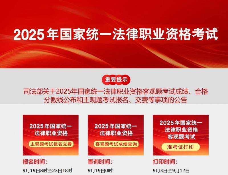 司法部发布2025年国家统一法律职业资格考试公告,明确客观题考试成绩于2025年9月19日公布。