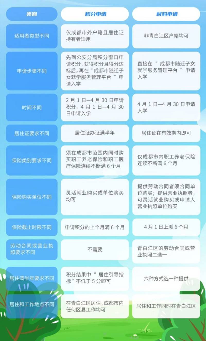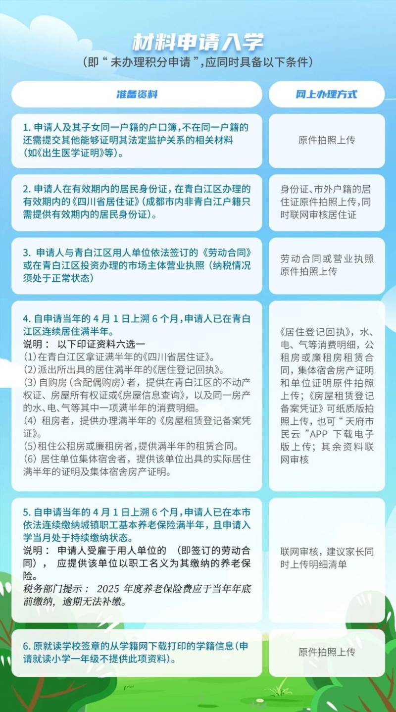 申请入学方式:积分申请入学和材料申请入学(即未办理积分申请),两种方式二选一