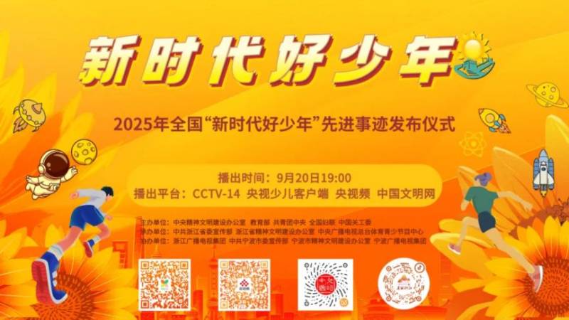 由中央精神文明建设办公室、教育部、共青团中央、全国妇联、中国关工委联合主办的2025年全国“新时代好少年”先进事迹发布仪式,将于9月20日(星期六)19:00在中央广播电视总台央视少儿频道(CCTV-14)正式播出。
