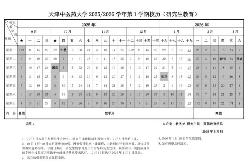 天津中医药大学2025-2026学年第一学期校历(研究生教育)