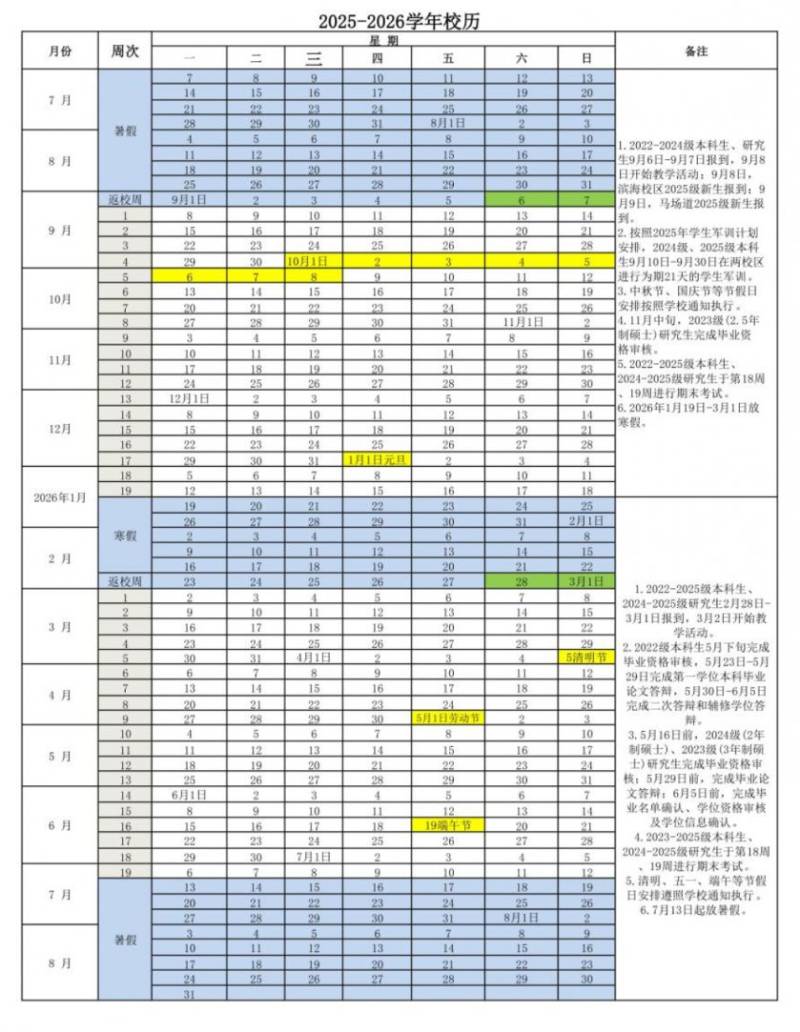 1.2022-2024级本科生、研究生9月6日-9月7日报到,9月8日开始教学活动;9月8日,滨海校区2025级新生报到;9月9日,马场道2025级新生报到。