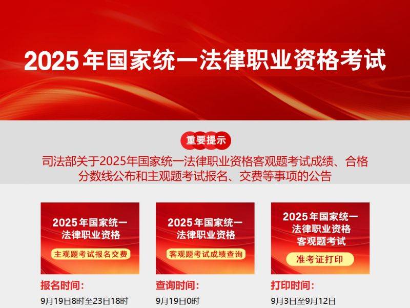 2025年国家统一法律职业资格主观题考试报名和交费时间为9月19日8时至9月23日18时。