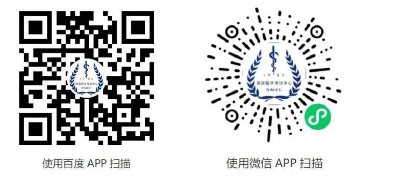 国家医学考试中心已开通百度小程序和微信小程序,考生可使用手机中的百度APP和微信APP,扫描二维码,输入“准考证号”、“证件编号”和“图片识别码”进行查询。