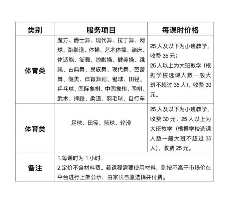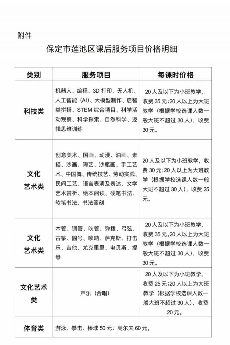 价格公示期为2025年9月23日起至9月28日,公示期内如有异议,可向我局成教三科反映(电话0312-5012612)。价格经公示生效后,所有课后服务入校相关活动(管理、开课、收费等)均须通过平台开展,接受平台的管理,未通过平台开展的,将按违规行为严肃处理。