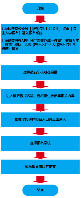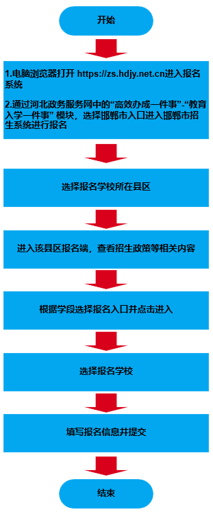 2.邯郸市义务教育阶段学校招生服务平台提供三种报名方式,一是微信搜索并关注“邯郸招生”公众号,点击【招生入学报名】菜单进入系统公众号端。二是电脑浏览器打开https://zs.hdjy.net.cn,访问“邯郸市义务教育阶段学校招生服务平台”。三是通过河北政务服务网或冀时办APP中的“高效办成一件事”-“教育入学一件事”模块,选择邯郸市入口进入邯郸市招生系统进行报名。