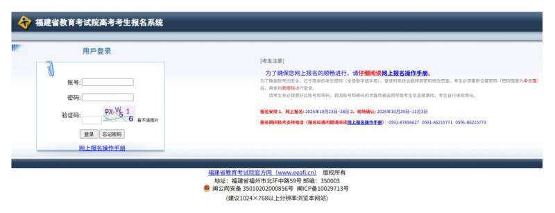 1.申请报名参加2026年我省普通高考的所有人员(包括保送生,“强基计划”,高水平运动队招生,运动训练、武术与民族传统体育专业招生,残疾考生单独招生,职教师资班,少年班等,下同)须于2025年10月23日至28日登录福建省教育考试院网站(www.eeafj.cn)“数字服务大厅—高考高招—高考考生报名系统”,进行网上账号注册、报名和缴费,逾期不予网上报名。