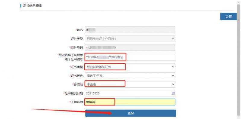 4.填写与个人取得的对应的证书信息、选择证书类型为“职业技能等级证书”、选择“参保地”、再填写实际报考的工种名称,然后点击查询。