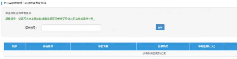 6.提交申请后,想查询申请进度如何。回到补贴申领页面,点击“失业保险技能提升补贴申请进度查询”。输入“证书编码”后即可查询。