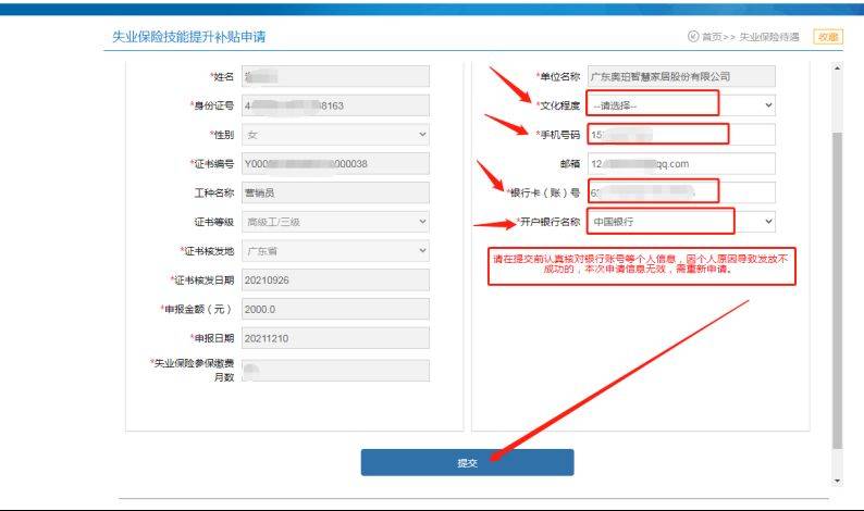 5.选择“文化程度”、核对信息,核对银行卡号以及开户行,最后确认信息无误,再点击提交。