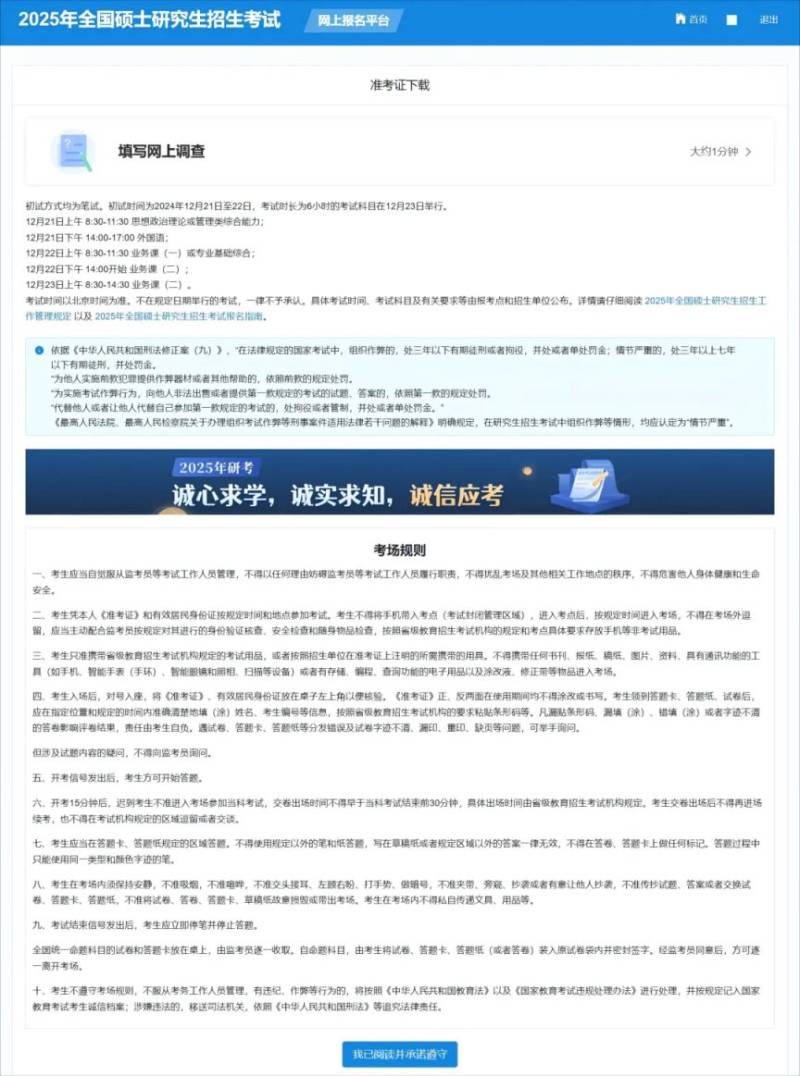 进入研招网报平台首页后,你将看到初试时间提醒、考场规则等内容,这个页面上的提示要认真阅读。