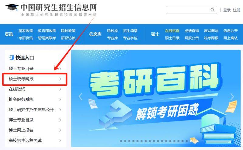 中国研究生招生信息网,简称“研招网”,进入研招网后,点击“硕士统考网报”