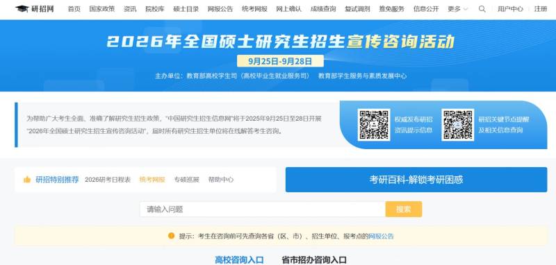 为帮助广大考生全面、准确了解研究生招生政策,“中国研究生招生信息网”于2025年9月25日至28日开展“2026年全国硕士研究生招生宣传咨询活动”,各研究生招生单位在线解答考生咨询。