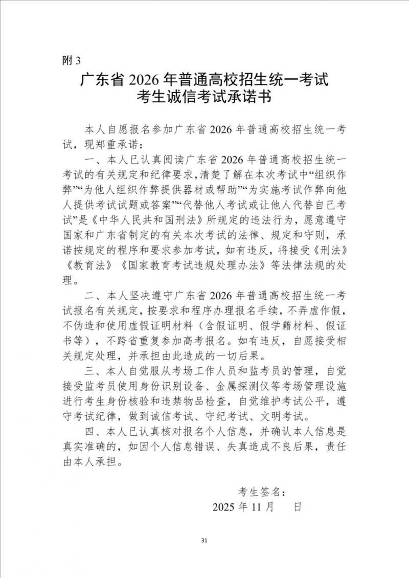 3.广东省2026年普通高校招生统一考试考生诚信考试承诺书