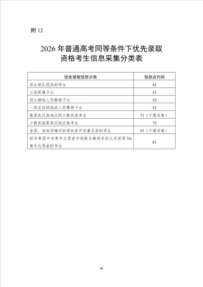 在《2026年普通高考加分资格考生信息采集分类表》(见附11)、《2026年普通高考同等条件下优先录取资格考生信息采集分类表》(见附12)中,凡信息点代码栏未注明“不需采集”的加分资格和优先录取资格类型,均须在普通高考报名时申报。
