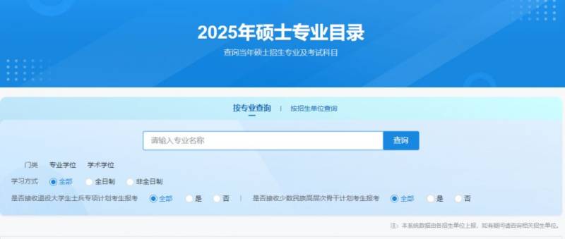 硕士专业目录查询方式更加灵活,支持按专业、按招生单位两种方式查询。