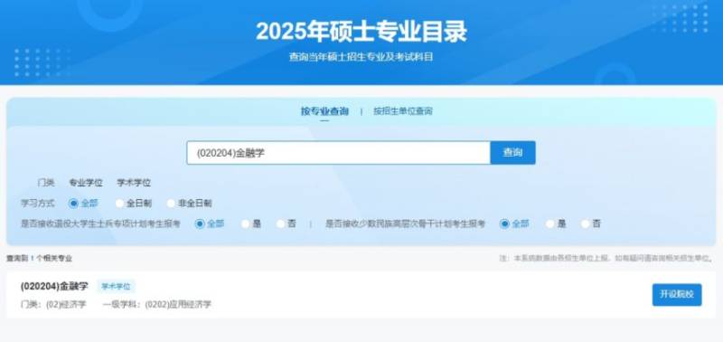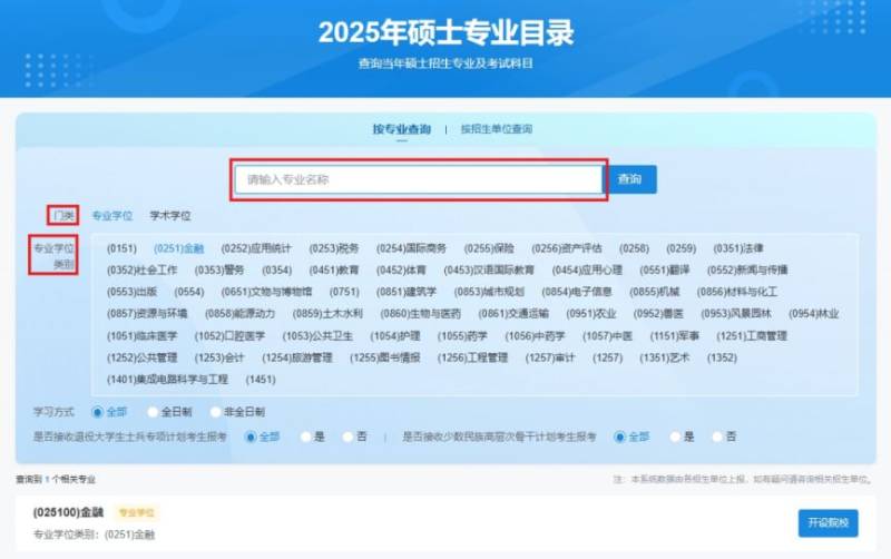 按专业查询:用于查询目标专业对应的开设院校及其开设详情。考生不仅可以按照专业关键词模糊搜索,同时能够通过门类、一级学科(专业学位类别)精准查询。