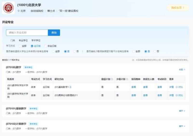 点击“展开”可查看招生单位的开设专业详情,包括但不限于院系所、考试方式、专业、学习方式、研究方向、拟招生人数、考试科目等。