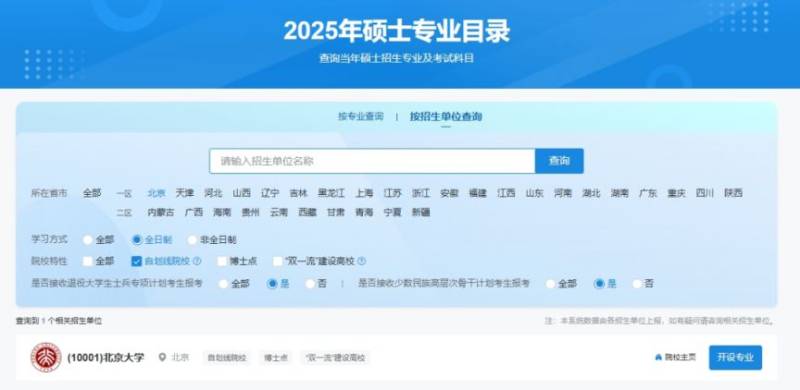 按招生单位查询:用于查询目标招生单位开设的所有专业详情。考生不仅可以按照招生单位名称查询,同时能够通过所在省市、学习方式、院校特性查询,今年还新增了是否“双一流建设高校”等选项提供考生筛选。