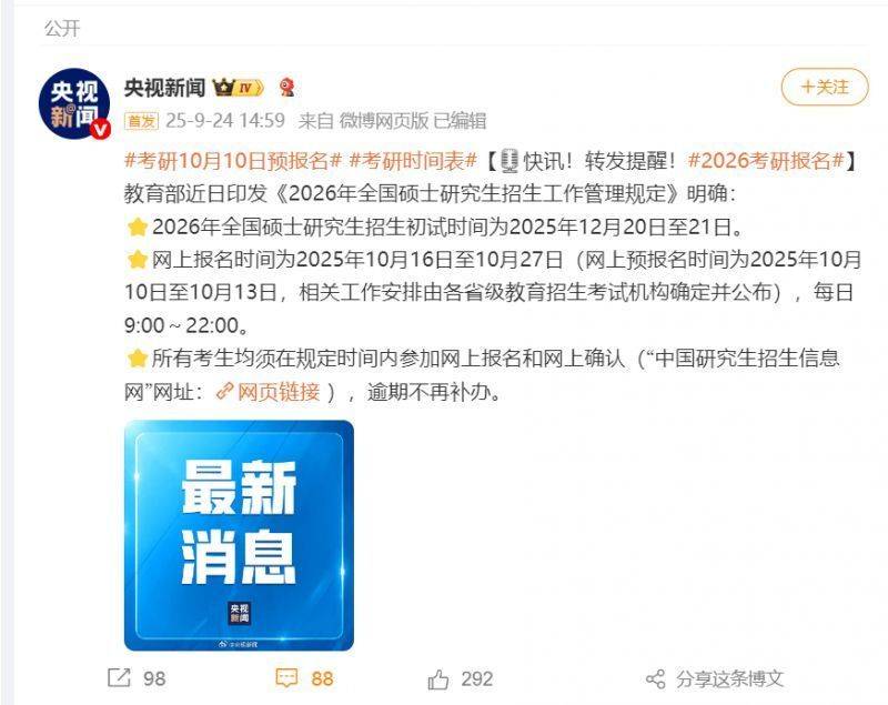 据央视新闻消息,教育部近日印发《2026年全国硕士研究生招生工作管理规定》明确:2026年全国硕士研究生招生初试时间为2025年12月20日至21日。