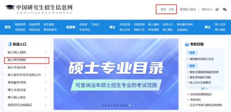 浏览器搜索“研招网”或输入研招网官方网址https://yz.chsi.com.cn/进入研招网,选择【硕士统考网报】。