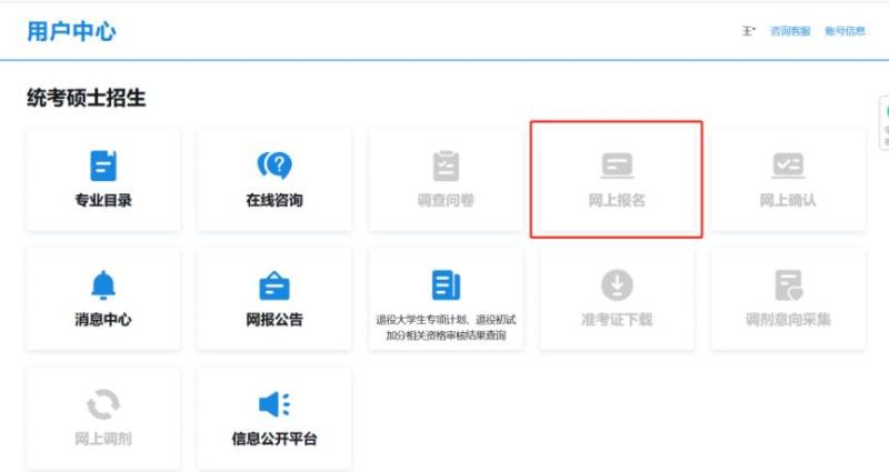 登录后选择【网上报名】进入报名界面。(预报名开启时这里会变成蓝色,可以点击)