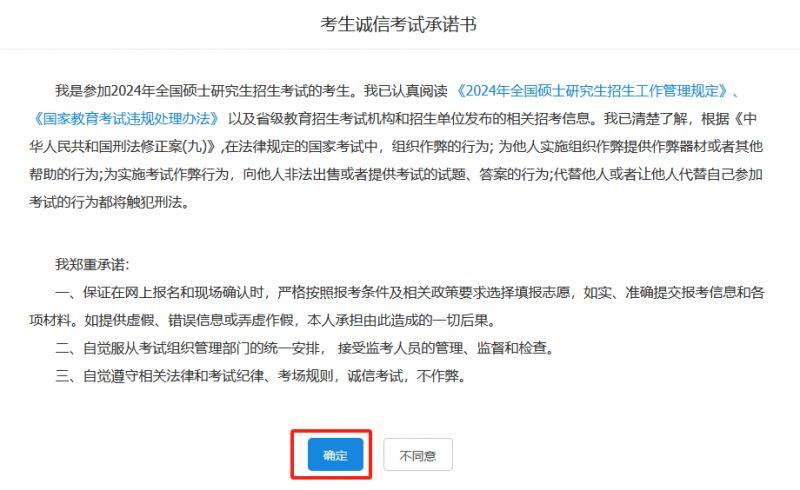 进来之后显示"考生诚信考试承诺书",等待10秒之后,点击【确定】。